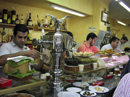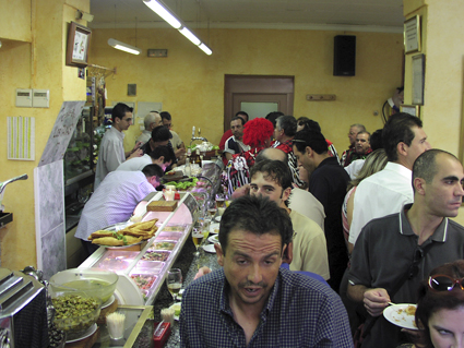 Es un bar juvenil con unas tapas muy interesantes, como son la carrillera de ternera, los michirones y las patatas cocidas o asadas acompañadas de un sustancioso alioli.Pero tampoco deben olvidarse las de la barra como la hueva de atun,los bocatines de muy diversas combinaciones, las anchoas en salmuera, y las virutas de jamon acompañadas de pequeñas rebanadas de pan recien tostadas y rociadas de aceite de oliva, todo ello acompañado de una riquisima cerveza de barril en jarra,caña o "bolito". Posee una esquisita bodega en vinos de variadas demonminaciones de origen. También se puede disfrutar de un buen marisco fresco (gamba blanca y roja, cigalas, necoras, ostras, almejas de carril...) bien acompañadas con vino blanco de rueda, albariño, cava o chapangne. Tiene servicio de mesas, aunque se recomienda que en fines de semana se solicita reserva.