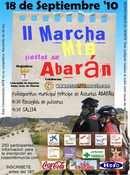 SILa Concejalía de Deportes del Ayuntamiento de Abarán y Rutas MTB Murcia comunican que ya se ha cubierto el límite de plazas para participar en la segunda Ruta de Mountain Bike por Abarán prevista para el próximo 18 de septiembre.