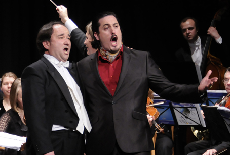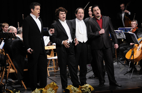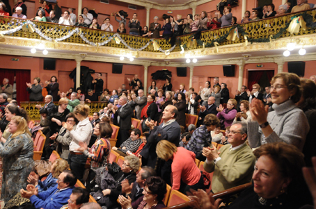Fuera de programa hubo “propinas” muy de agradecer, como La Marcha de los Reyes Magos, melodía popular de Provenza, con una orquestación preciosista y, como final de concierto un mosaico (popurrí) a cargo de la orquesta y los cuatro tenores con temas muy variopintos, acabando con la napolitana O solo mío” compitiando los ases líricos con los adornos trisados del agudo final. El concierto acabó –no podía ser de otra forma con la marcha Radisku. Para que decir del ambiente. El público, de pié, ovacionó una y otra vez, con palmas que humeaban el radiante y totalmente iluminado recinto del clásico, coqueto y recoleto Teatro Cervantes, que gracias a la gestión y organización de la Asociación Lírica Amigos de la Zarzuela de Abarán, y al esfuerzo y la confianza depositada por la Directora de Concerlírica Internacional, Leonor Gago, está viviendo una etapa de resurgimiento del ostracismo en que estaba sumido.