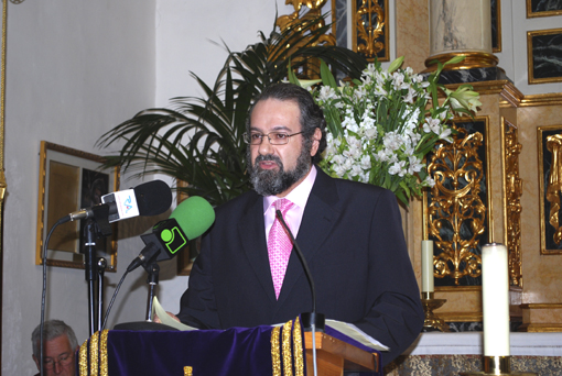 En su intervención ha habido espacio para las procesiones, que para Gómez se desarrollan <<a modo de Vía Dolorosa y las distintas Hermandades portan sobre sus hombros un pedazo de la Historia Sagrada>>.
