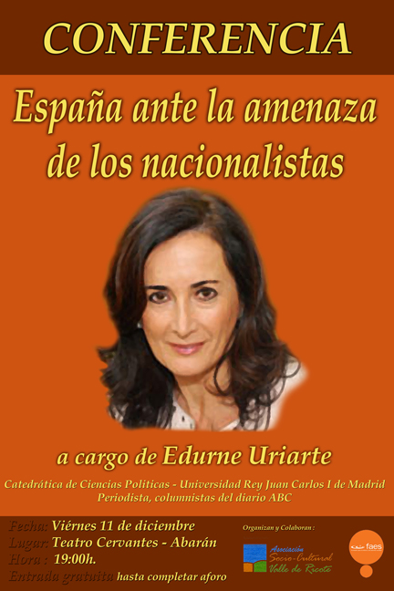Edurne Uriarte, Catedrática de Ciencias Políticas de la Universidad Rey Juan Carlos I de Madrid, ofrecerá el viernes 11 de diciembre en el Teatro Cervantes la conferencia titulada “España ante la amenaza de los nacionalistas”. El acto, organizado por la Asociación Socio- cultural Valle de Ricote, tendrá lugar a las 19.00 horas, con entrada gratuita hasta completar aforo.